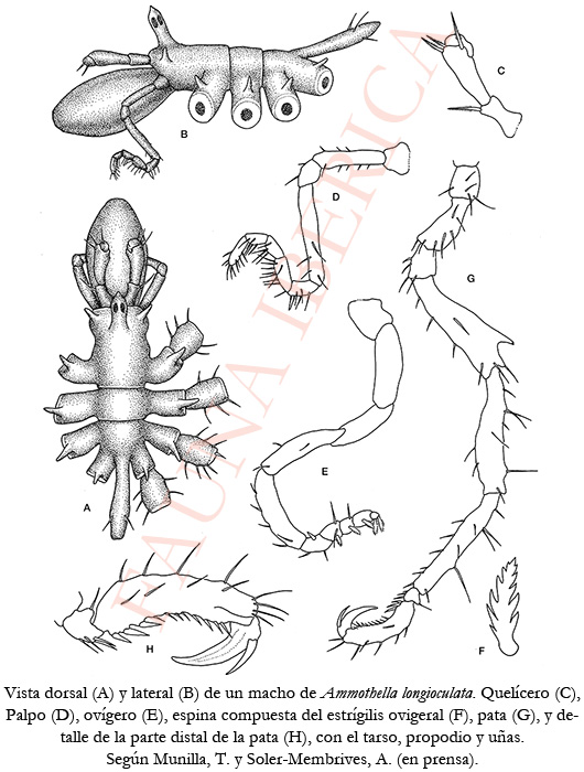 Longitud corporal de 1 mm. Tronco ovalado, de color amarillento, liso, bien segmentado, excepto los segmentos tercero y cuarto que están soldados. Prolongaciones laterales un poco separadas, igual o menos que la mitad de su diámetro; portan un tubérculo dorsodistal asetado y no centralizado. Céfalon cuadrangular, con un par de tubérculos en los ángulos anteriores. En medio del céfalon se encuentra el tubérculo ocular, que es bastante largo y cilíndrico, y con cuatro ojos distales. Trompa ovoide y lisa, más bulbosa que A. longipes. El abdomen, con un par de setas distales, supera la longitud de la primera coxa de la cuarta pata. Los quelíceros poseen un escapo biarticulado, en el que existen espinas distales plumosas; en los adultos acaban en un muñón. Los palpos tienen nueve artejos, el segundo es algo más corto que el cuarto, los cinco distales son subiguales, tienen sedas por un lado y el último de ellos es algo más largo que el penúltimo. Los ovígeros son de 10 artejos, de los que los cuatro últimos (estrígilis) portan una espina compuesta cada uno, y el último dos (fórmula ovigeral 1:1:1:2). Las patas cuentan con espinas lisas y algunas plumosas, en especial a nivel de las primeras coxas. De los tres segmentos largos, la segunda tibia es la mayor en el fémur y se diferencia un saliente dorsodistal, que representa el tubo cementante de los machos. El tarso es corto y el propodio lleva tres espinas mayores en la zona interna de la suela, seguidas de una serie de seis a nueve espinas pequeñas. Las uñas secundarias son aproximadamente la mitad de las principales.