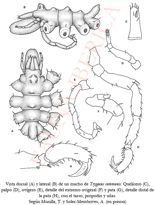 Longitud corporal media de 2-3 mm, y longitud media de las patas de 4-5 mm. Cuerpo de color amarillento, alargado, fusiforme y con pocas setas, tanto en el tronco como en las patas. Los segmentos troncales tienen tres suturas articulares perfectamente marcadas y, además, en la parte centrodorsal posterior de los tres primeros destaca un abultamiento de perfil triangular, siendo el del segundo segmento mayor que los demás. Las prolongaciones laterales son tan largas como anchas y están separadas por una distancia aproximadamente igual a la mitad de su anchura; dichas prolongaciones acaban en tres espinas distales. El tubérculo ocular es tan alto como ancho y termina en punta obtusa anterior, no centralizada; está situado en la parte anterior del céfalon y lleva cuatro ojos no pigmentados. La trompa o probóscide es recta, pseudocilíndrica y algo truncada apicalmente, aunque Bouvier (1923) y Stock (1968a) la dibujan con el tercio apical más delgado. El abdomen es de mediana longitud, doble de largo que de ancho, recto y casi vertical, finaliza en un ápice agudo y ladeado. Quelíceros cilíndricos, lisos, monoarticulados, sin quela y con algunas espinas distales; dorsalmente sobrepasan la mitad de la longitud de la trompa. Cerca del ápice aparece una espina muy fuerte que bien podría ser el resto del dedo móvil. Palpos de cinco a siete artejos, siendo el tercero el más largo y algo torcido distalmente; después del tercer artejo presentan uno corto y otro largo, o cuatro cortos subiguales. Hay pocas espinas dispersas en los palpos aunque son más abundantes en el artejo distal. Ovígeros de 7 a 10 artejos, siendo el antepenúltimo más espinoso (espinas que son sigmoides en el holotipo) y más ancho y largo que los dos posteriores, con los cuales se articula anaxialmente. El octavo artejo de algunos ejemplares masculinos o femeninos varía en estación. La inserción ovigeral se sitúa junto a la primera prolongación lateral. Patas de mediana longitud, poco espinosas, con las coxas primera y tercera subiguales en tamaño y la segunda un poco mayor; la primera coxa lleva dos pares de espinas dorsodistolaterales. El fémur porta un tubérculo dorsodistal delante del cual existe un poro cementante poco desarrollado; éste es algo mayor que las tibias, que a su vez son subiguales. El propodio, fuerte y curvado, cuenta con dos o tres espinas fuertes en el talón y algunas más pequeñas en la suela. Las uñas secundarias son la mitad de largas que la principal.