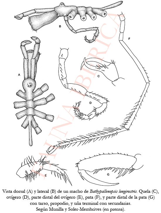 Longitud corporal: 6-16 mm y longitud de las patas 3,5-4,0 veces la longitud corporal. Tronco glabro y completamente segmentado. Las prolongaciones laterales, el doble de largas que anchas, son lisas y están separadas por más de su propio diámetro en los bordes distales. Tubérculo ocular bajo y redondeado, tan alto como ancho, con cuatro ojos débilmente pigmentados, siendo los delanteros algo mayores que los traseros; órganos laterales de Solokov conspicuos. Probóscide casi cilíndrica, con constricción medial y más ancha apicalmente, con una corona de setas distales; llega hasta más de la mitad del segundo artejo queliceral. Abdomen largo, liso, erecto e inclinado alrededor de 30º, alcanza el extremo distal de las segundas coxas de las cuartas patas. Quelíceros con escapos conspicuos, con el primer artejo más largo que el segundo, que a su vez presenta algunas espínulas. Quela ligeramente más corta que el segundo artejo del escapo, con dedos más largos que la palma que se cruzan en su final. El dedo fijo lleva una serie de setas en su tercio basal externo; dedos sin setas en la zona interna, que es cóncava y deja un amplio espacio ojival entre los dedos. Palpos reducidos a un lóbulo lateral en la zona lateroventral del cuello, a nivel de la zona basal de la trompa. Ovígeros de 10 artejos e implantados en la zona ventral, justo delante de las primeras prolongaciones laterales; el segundo artejo es el más largo, seguido del cuarto y del quinto. Los artejos quinto y sexto llevan algunas setas. Los cuatro últimos disminuyen paulatinamente de tamaño y portan abundantes espinas. Las patas son delgadas y largas. La segunda coxa es la mayor, pero de menor longitud que la suma de las otras dos, siendo todas casi lisas. La segunda tibia es el segmento más largo y espinoso (espinas cortas y largas); por su parte la primera presenta más espinas que el fémur, casi glabro y algo curvo. El propodio es casi recto y sin talón, está armado en su cara interna proximal con pocas espinas grandes y fuertes, seguidas de otras pequeñas; las de la zona externa son de menor tamaño. La uña principal es casi tan larga como el propodio y las uñas auxiliares no alcanzan la tercera parte de la principal, en la cual se insertan.