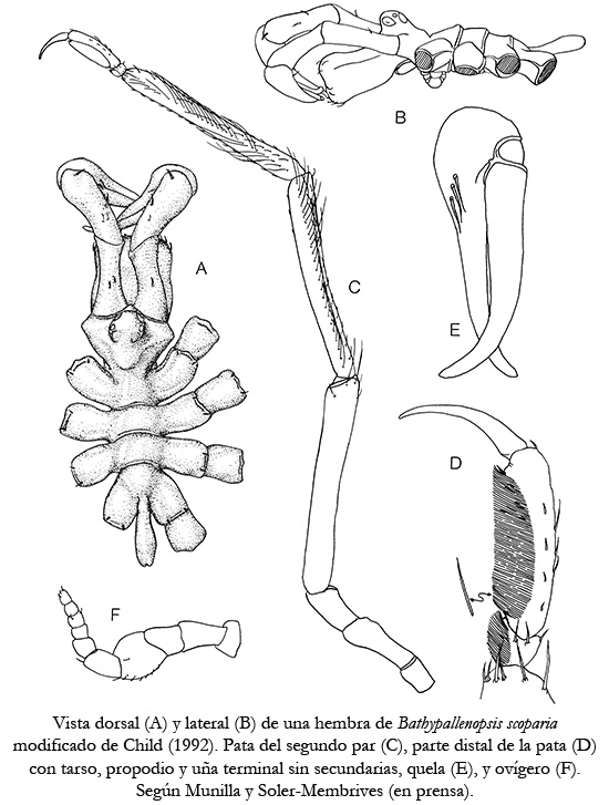 Longitud corporal de 4 mm y patas entre tres y media y cuatro veces más largas. Tronco glabro y completamente segmentado, siendo los segmentos algo más anchos que largos. Las prolongaciones laterales son casi glabras, solo con un par de setas dorsodistolaterales; en los bordes distales, están separadas por la mitad de su propio diámetro o menos. Segmento cefálico subtriangular muy ancho por delante y sin cuello. Tubérculo ocular bajo y romo, más ancho que alto, con cuatro ojos débilmente pigmentados: los delanteros mayores que los traseros; órganos laterales de Solokov conspicuos. Probóscide casi cilíndrica, más ancha en el ápice y con la base bastante más estrecha que el resto; alcanza la base del segundo artejo queliceral y porta algunas setas distales. Abdomen liso y bífido, erecto y horizontal, que llega al extremo proximal de las segundas coxas de las cuartas patas. Quelíceros con escapos biarticulados, con los dos artejos igual de largos, ambos con algunas espínulas. Quela de similar longitud que el segundo artejo del escapo, con dedos más largos que la palma que se cruzan en su final. El dedo fijo lleva algunas setas en su tercio basal externo; los dedos no poseen dientes en la zona interna y acaban en una punta curvada hacia adentro a modo de garfio. Palpos reducidos a un lóbulo lateral en la zona lateroventral del cuello, por debajo del tubérculo ocular. Ovígeros pequeños e implantados ventralmente junto a las primeras prolongaciones laterales. Poseen 10 artejos cortos, de los que el quinto es el más voluminoso en las hembras; los cuatro últimos disminuyen paulatinamente de tamaño y portan pocas espinas. Las patas son delgadas y largas. Coxas prácticamente lisas, la segunda es algo menor que la suma de las otras dos. El fémur, en los machos, presenta una ligera proyección no centrada y ventral que corresponde al poro cementante. Los segmentos largos son subiguales, o bien el fémur es un poco más largo; las dos tibias llevan largas y abundantes sedas en dos filas, a diferencia del fémur, que es casi glabro. El propodio es casi recto y sin talón; los tres primeros pares de patas presentan un propodio y un tarso con abundantes y largas sétulas a modo de pincel plano; el cuarto par solo lleva una espina tarsal y algunas espinitas de diferente tamaño en la base de la suela propodial. La uña principal mide 2/3 de la longitud del propodio y no presentan uñas auxiliares.