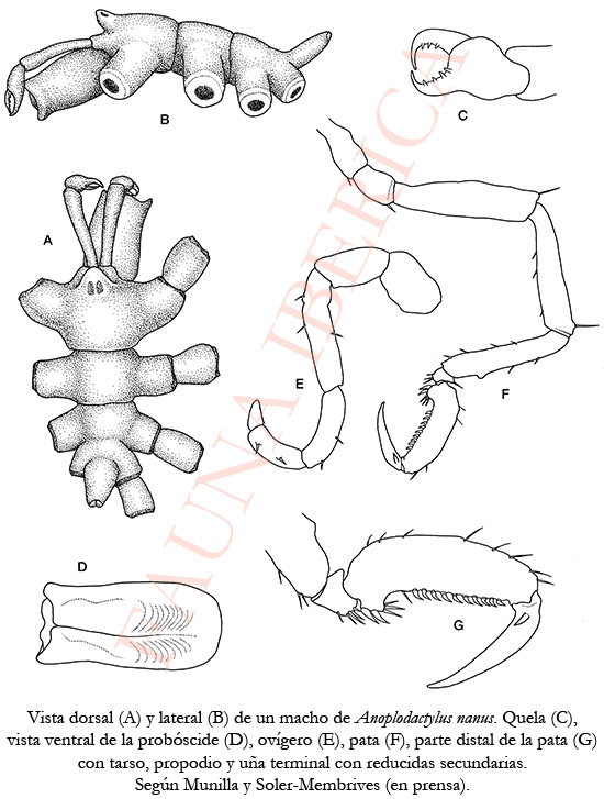 Longitud corporal alrededor de 0,5 mm y longitud de las patas tres veces la corporal. Cuerpo pequeño, liso, glabro y compacto. Parte anterior del céfalon corta, aproximadamente la cuarta parte del escapo. Primer segmento troncal triangular. En vista dorsal solo se observan dos suturas, ya que los segmentos tercero y cuarto están fusionados; ventralmente aparece una sutura parcial entre dichos segmentos. Prolongaciones laterales glabras y cortas, separadas por algo menos que la mitad de su diámetro. Tubérculo ocular romo, subtriangular, situado en la parte anterior del céfalon, inclinado hacia delante y con cuatro ojos pobremente pigmentados. Trompa cilíndrica en vista dorsal, tan larga como el escapo, pero con ángulos bien marcados en los antímeros de la parte ventral anterior; presenta una aparente sutura a lo largo de la línea media de dicha zona, que separa los dos antímeros. Quelíceros algo más largos que la trompa, con un escapo largo, delgado y uniarticulado. Quela inclinada hacia delante, con dedos cortos, muy curvados y con tres o cuatro dientes internos. Palma robusta y sin dientes. Como todos los miembros de la familia, no posee palpos. Ovígeros de seis artejos: el tercero es el más largo, el último el más corto y carece de espinas mientras que el quinto artejo porta dos espinas externas destinadas a sujetar la bola de huevos. Patas relativamente largas y poco espinosas. Primera y tercera coxas subiguales en tanto que la segunda es más larga. Poros genitales solo en las segundas coxas de las patas primera y segunda. Fémur y primera tibia subiguales, segunda tibia algo menor y con más espinas que los anteriores. En los fémures masculinos hay seis poros cementantes dorsales pero sin ducto. Tarso corto, lleva de cinco a ocho espinas. Propodio curvado externamente y recto en su interior, con un talón bastante desarrollado, el cual porta cinco espinas, dos fuertes y tres débiles; le sigue una suela recta con 9-11 espinas algo curvadas y sin lámina distal. Uñas principales casi tan grandes como el propodio y las secundarias, insertadas lateralmente en las anteriores, son muy reducidas y representan 1/8 de las primarias. Esta especie, por la trompa angulosa por delante, forma parte del grupo angulatus (Krapp et al., 2008). Se distingue de A. angulatus por su pequeño tamaño, la mitad que A. angulatus, por la existencia de una sutura ventral entre los antímeros de la probóscide, por estar los segmentos troncales tercero y cuarto fusionados y por el número de poros cementantes en el macho (3-4 en A. angulatus y 6 en A. nanus).
