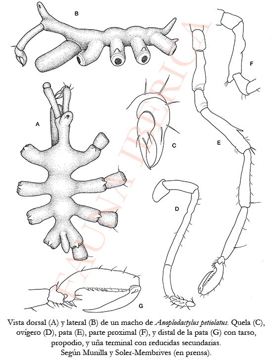 Longitud corporal alrededor de 1 mm y longitud de las patas 3-4 veces la longitud corporal. Cuerpo pequeño, casi glabro y no compacto. Dorsalmente no se observan suturas, solo se insinúan en algunos ejemplares las dos primeras, y siempre están fusionados los segmentos tercero y cuarto. No aparecen espinas ni tubérculos en la parte central del el tronco. Las prolongaciones laterales presentan un tubérculo dorsodistal y están separadas por una distancia aproximada a su propio diámetro. La parte anterior del céfalon es larga, esbelta, ascendente y sobrepasa la mitad de la trompa. El tubérculo ocular es alto y romo, lleva cuatro ojos pigmentados y está inclinado hacia delante hasta sobrepasar el céfalon. Trompa cilíndrica y roma en vista dorsal, tan larga como el escapo; es lisa e inclinada hacia la parte inferior unos 45º. Abdomen simple y fusiforme, inclinado hacia arriba unos 45º y llega hasta la mitad de la primera coxa del cuarto par de patas. Quelíceros algo más largos que la trompa, con un escapo largo provisto de algunas setas dorsodistales, delgado y uniarticulado. Quela inclinada hacia delante formando ángulo de 90º con el escapo, con dedos más largos que la palma, curvados y sin dientes internos; palma robusta y con pocas espinas. Sin palpos. Ovígeros de seis artejos, siendo el tercero el más largo (el doble que el segundo) y el último parece una corta y cónica verruga con algunas setas. El quinto artejo presenta por fuera tres o cuatro filas de espinas iguales, destinadas a sujetar la bola de huevos. Patas relativamente largas y poco espinosas. Coxas primera y tercera subiguales, siendo la segunsa más larga que la suma de las anteriores. Poros genitales solo en las segundas coxas de las patas tercera y cuarta. Fémur mayor que las tibias y éstas subiguales. En los fémures hay un ducto cementante inclinado, dorsal y mediano. Tarso corto. Propodio curvado externamente y recto en su interior, con un talón bastante desarrollado, el cual porta dos o tres espinas fuertes; le sigue una suela recta con cinco espinas, algo curvadas, y a continuación la lámina distal que ocupa la mitad de la suela propodial y que suele ir acompañada por sedas submarginales. Uñas principales casi tan grandes como el propodio y las secundarias, que nacen lateralmente de las anteriores, son 1/7 de las primarias.