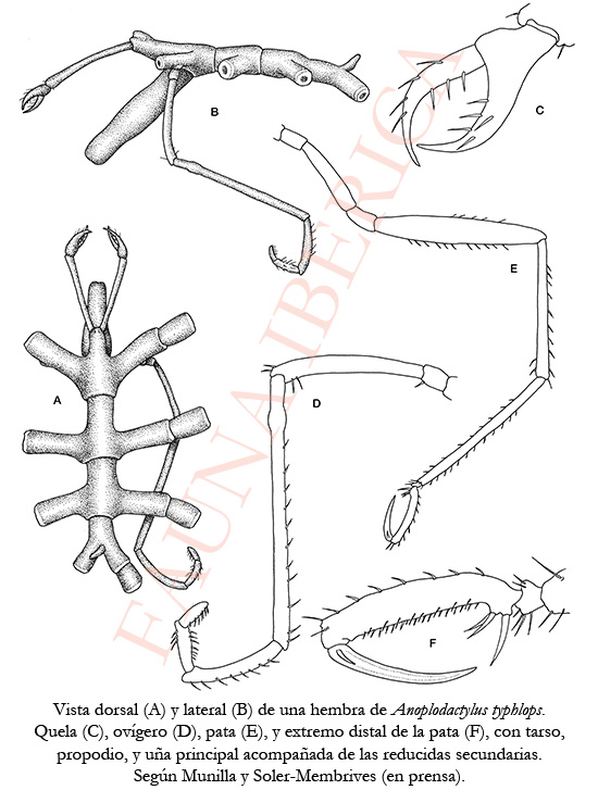 Longitud corporal alrededor de 3 mm, y longitud de las patas de cuatro a cinco veces la longitud corporal. Especie de color verde o blancuzco. Tronco bastante alargado y delgado, glabro, sin protuberancias ni formaciones epidérmicas, y plenamente segmentado. Procesos laterales lisos, bastante más largos que anchos, sin tubérculos ni espinas; están separados por una distancia doble o algo más que su propio diámetro; en la parte ventral de la primera prolongación lateral se insertan los ovígeros (detalle singular). El extremo anterior del céfalon sobresale y tapa la base de la probóscide. Tubérculo ocular ausente y sin ojos, si bien algunos ejemplares pueden tener un ligero abultamiento. Probóscide tan larga como el tronco, cilíndrica, roma, con su máximo diámetro en el centro e inclinada unos 45º hacia abajo. Abdomen corto, en forma de clava, recto y liso, inclinado 60º hacia arriba y con un par de espinas subdistales y laterales. Quelíceros con un escapo uniarticulado, cilíndrico y delgado, tan largo como la trompa, con alguna seta dispersa. Palma bastante más corta que los dedos, los cuales son largos, curvados y tienen tres espínulas internas y 2-5 externas. El dedo móvil es algo más largo que el fijo, cruzándose ambos en el extremo distal y dejando un espacio ojival entre ellos. Sin palpos, como todos los miembros de la familia. Ovígeros largos, finos y formados por seis artejos, de los cuales el tercero es el más largo y posee una fila de espinas laterales y un ligero engrosamiento en el tercio proximal; el segundo cuenta con dos pares de espinas distales, el último es más corto que el penúltimo y ambos llevan una o dos filas de espínulas. Las patas (fig. 109E) son finamente espinuladas, con espinas que no superan el diámetro del artejo correspondiente. Coxa segunda más larga que la suma de las otras dos. Fémur más largo que las dos tibias, que a su vez son subiguales. El fémur de los machos porta en su parte media dorsal un ducto cementante bastante acusado. Tarso compacto. Propodio largo y estrecho, algo curvado externamente y casi recto por dentro, con un talón conspicuo armado de tres espinas, una más grande que las otras dos, que a su vez están yuxtapuestas; la suela, que no posee lámina, contiene una serie de cortas espinas y algunas espínulas submarginales. La uña principal mide como la suela del propodio; las secundarias, que se insertan lateralmente a la principal, son 1/10 de la misma.