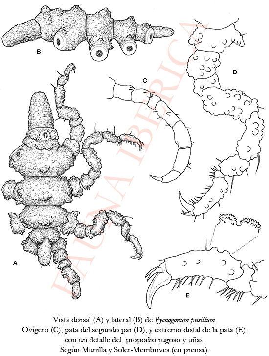 Longitud corporal entre 2 y 3 mm y longitud de las patas delanteras similar a la longitud corporal. El tegumento está cubierto de pequeñas verrugas o gránulos separados (tipo Chagriné de Bouvier, 1923), con algunos granitos diminutos sobre cada gránulo. Tronco doble de largo que de ancho, macizo y plenamente segmentado, con segmentos que van disminuyendo en tamaño (anchura y longitud) a medida que nos acercamos al abdomen. Cada segmento (excepto el cuarto), posee una ligera prominencia verrucosa o tubérculo dorsomedioposterior romo, visible de perfil. Las prolongaciones laterales son cortas, casi tan anchas como los segmentos y separadas en V; también cuentan todas ellas con un leve tubérculo dorsodistal, siendo los del primer par los más pequeños. Zona anterior del céfalon más o menos recta. Tubérculo ocular romo, más ancho que alto, que porta cuatro ojos pigmentados. Probóscide con perfil ventral recto y el dorsal curvo, troncocónica en su mitad distal y cilíndrica en la mitad proximal, recta, con rugosidades y sin tubérculos especiales. Abdomen subcilíndrico, recto, sin tubérculos y romo, con hendidura rectal visible en su extremo y que alcanza el final de las segundas coxas del cuarto par de patas. Sin quelíceros ni palpos en adultos ni en juveniles. Ovígeros de siete artejos solamente en machos (característica del subgénero Retroviger) y acabados en uña curvada; poseen escasísimas espinas pequeñas. Los artejos cuarto al sexto son más grandes que el segundo y el tercero. Primer y segundo par de patas de longitud similar al cuerpo y más grandes que las posteriores, pero provistas de gránulos como el resto del cuerpo; la disminución de su tamaño a medida que se acercan al abdomen es parangonable a lo que ocurre con el tamaño de los segmentos. La primera coxa es mayor que cualquiera de las otras dos y porta dos tubérculos laterales, excepto las del primer par de patas. El fémur es el artejo más desarrollado de la pata y posee dorsodistalmente una giba rugosa. Primera tibia más larga y ancha que la segunda. Fémur y tibias poseen alguna espina lisa dorsal más larga que otras, pero carecen de espinas ventrales. Tarso compacto y ventralmente espinoso. Propodio algo curvado, sin espolón, de similar anchura en ambos extremos, con espinas finas y similares a lo largo de los dos lados pero más abundantes en la suela. El propodio de las primeras patas tienen más espinas en su suela que el de las patas traseras –la primera pata presenta 10 mientras que la cuarta pata solo lleva 5–. Uña principal tan larga como la mitad del propodio. Las uñas auxiliares miden 1/3-2/5 de la longitud de la principal.