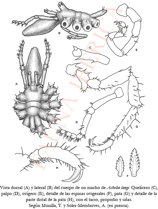 Longitud corporal sobre los 2.5 mm. Tronco elíptico, segmentado, excepto los segmentos tercero y cuarto que están fusionados. Prolongaciones laterales subcuadradas y juntas en la mayor parte de su extensión, con dos tubérculos setados distodorsales (uno mayor que el otro). Céfalon cuadrangular, con un par de tubérculos setados laterales. Tubérculo ocular con 4 ojos. Trompa con su mayor diámetro en medio de su longitud y una ligera estrangulación a un tercio de la base. Abdomen estrecho e inclinado. Quelíceros casi cilíndricos, algo menores que la mitad de la trompa; pinza reducida a un muñón mucronado . Palpos con ocho artejos de los que el segundo y el cuarto son los más largos, y los cuatro distales subiguales. Presentan ovígeros en ambos sexos, con 10 artejos muy dispares. Estrigilis con espinas compuestas de 7 a 9 pares de dientes. Fórmula: 2: 2: 1: 2-3; sin uña terminal. Patas espinosas y compactas con las tres coxas subiguales en las hembras. Las primeras coxas poseen dos pares de tubérculos setados mientras que las segundas coxas tienen dos o tres pares. Fémur y tibias subiguales en longitud, tarso muy pequeño; propodio sin talón y bastante curvado, con tres espinas mayores en la zona basal. La uña principal mide aproximadamente la mitad del propodio. Las uñas secundarias alcanzan de los ⅔ a ¾ de la principal.
