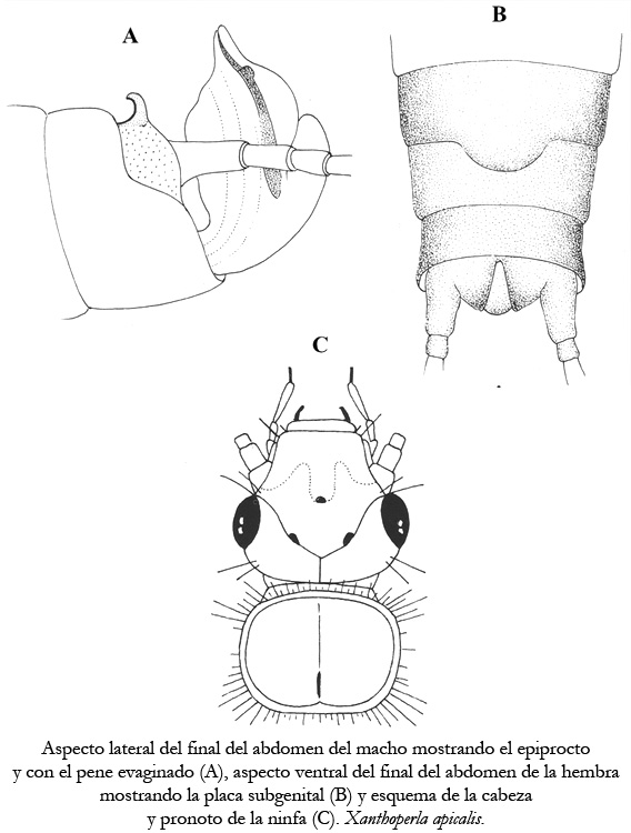 Longitud del cuerpo: machos 5,5 mm, hembras 6,0 mm. Longitud del ala anterior: machos 6,0-6,9 mm, hembras 6,8-7,9 mm. Adultos: Especie bien diferenciada por su pequeño tamaño, grandes ojos prominentes y por la estrechez y longitud relativa de su pronoto. Coloración de la cabeza amarilla pálida, salvo los márgenes ocelares negros, relativamente grandes. Cabeza ancha, con los ojos convexos y salientes, sobre todo en los machos. Pronoto relativamente largo sin dibujos ni márgenes, con una línea mediana extremadamente fina. Abdomen con banda oscura dorsal relativamente corta que no alcanza el segmento 7º. Patas amarillas con pilosidad abundante del color general del cuerpo. Cercos pálidos, más cortos que el abdomen. Macho: El epiprocto, en vista lateral, curvado con la extremidad dorsal en gancho agudo, poco pigmentado; en vista dorsal el gancho está escotado. El esclerito del saco peneal presenta una morfología característica (ver dibujo). Hembra: Placa subgenital pequeña y con una fila de sedas marginales. Ninfa: ver descripción general de la ninfa del género Xanthoperla.